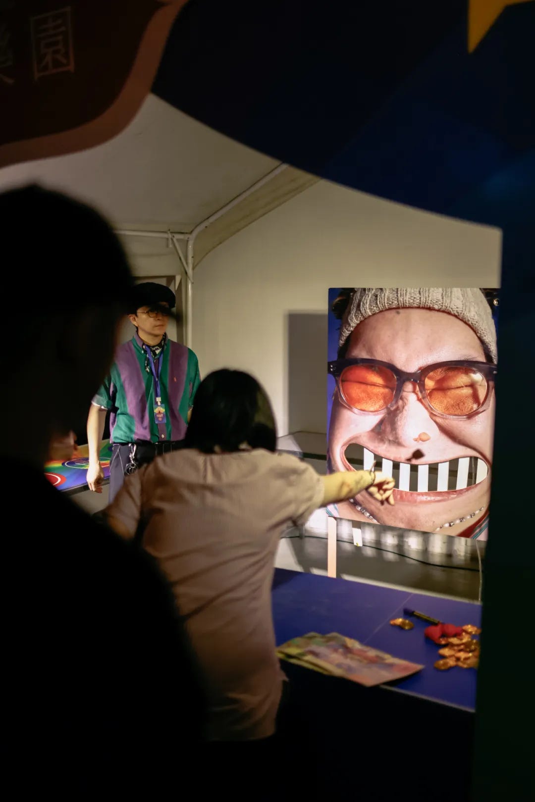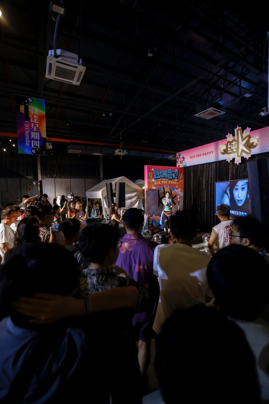 也的确,对于一个“乐迷活动”这样的 title 而言,“小奔走缤纷乐园”显得并不那么恰当:主要作为艺展的厂房如果没有当晚已经相对完善的音响会带来回响浑厚的声场,在音乐人登台前没有任何人知道当晚的 Lineup,调音台的背后不是转播屏,而是一个随时对舞台产生干扰的纯K“堂K”…… 在大奔走音乐节开始奔走之前,发达星期四决定在此进行一次“迷你款”试演(尽管千余人在场已经是相当大的派对体量),也由此,在繁杂多元的各色设施与摊位,以及在正经中显得“非正式”的舞台设置和四处游走寻找 NPC(当晚有集章活动设定)的人群里,小奔走显得不像“室内音乐节”或拼盘演出,而的确成为了一场活脱在乐园里的派对。