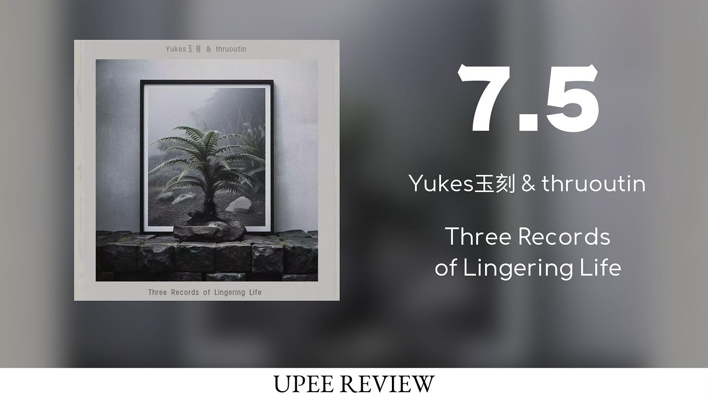由 Jyugam 厂牌发行,Yukes玉刻 与 thruoutin 的合作作品《Three Records of Lingering Life》(下称“余生三记”)在电古筝与电琵琶两种器乐构成的声音框架里,通过具有场域感的蜂鸣以及动态的合成氛围构建,捕捉了在回溯性视角中关于人生场景的三个时刻,以足具沉浸的触感完成了生命体验的一次速写。