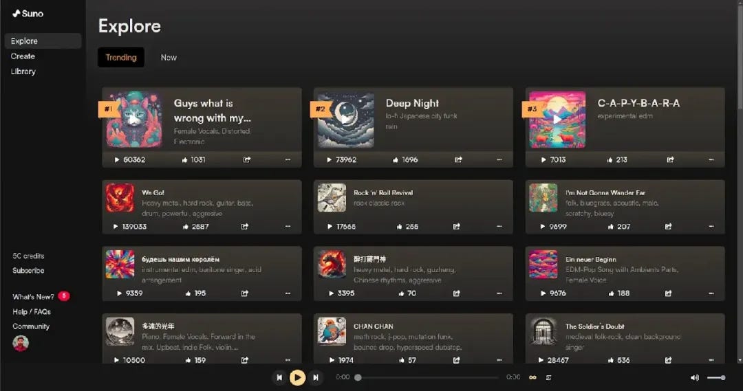 在这一趋势中,音乐生产也开始呈现出明显的产能爆发特征。以 Suno 为例,在模型训练完成后,音乐的生成不再需要创作周期或人类协作,只要输入自然语言的提示词,系统就可以在数秒内生成一首完整曲目,并在同一时间尺度内持续输出大量作品,其产量仅受算力与平台调度能力限制。